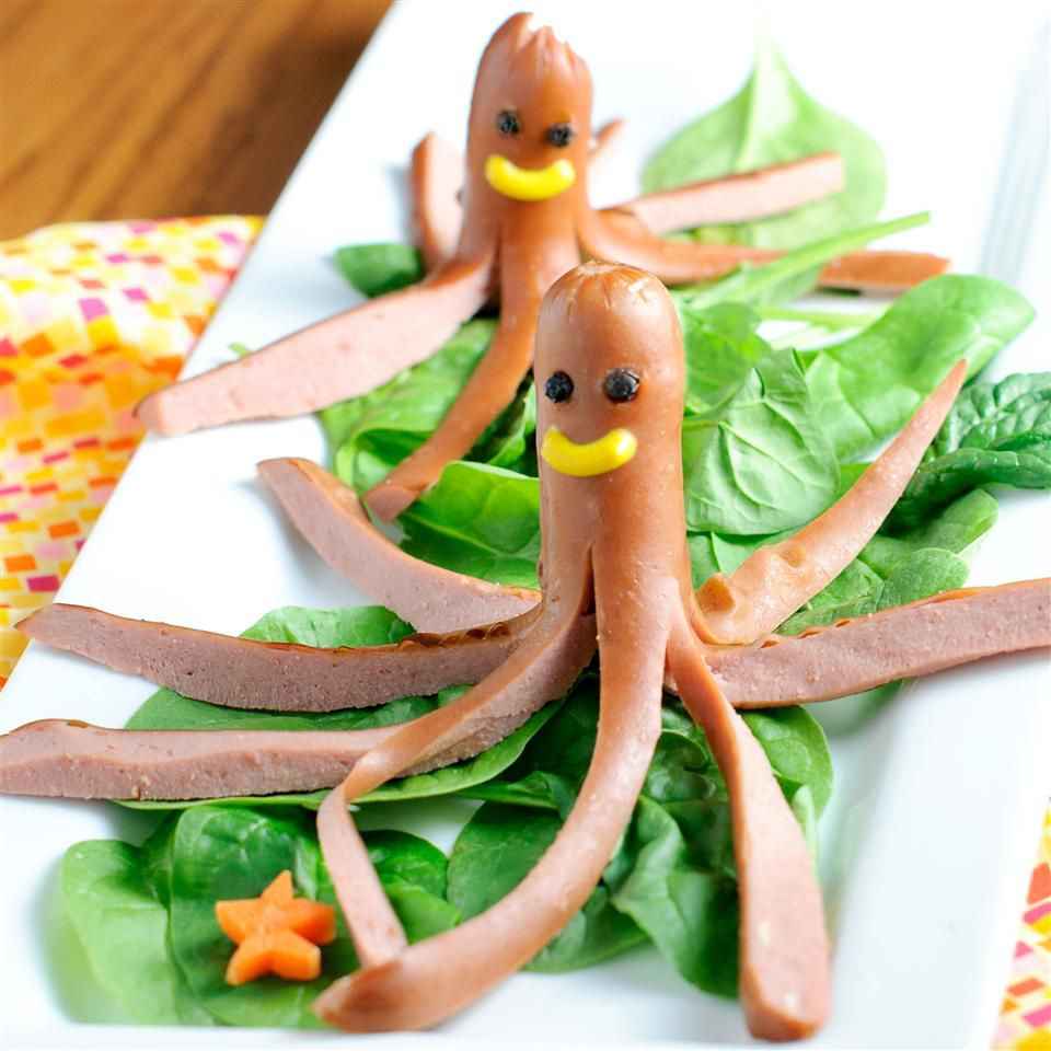- Step 2:Cut hot dogs in half. To make the 'legs' of the octodog, make 3 cuts on 1 side of each hot dog, leaving about 1/3 the rounded top of the hot dog for the 'head'. Turn hot dog over and make 3 more cuts, so you have 8 'legs'.