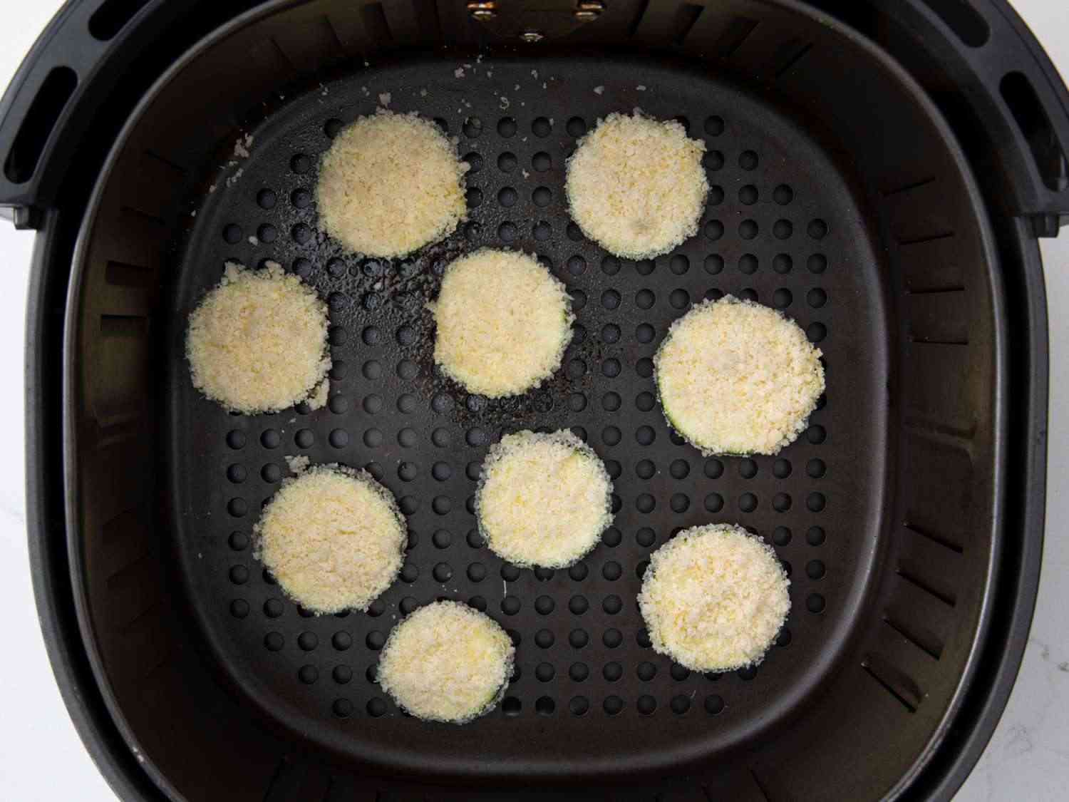 - Step 5:Cook in the preheated air fryer for 10 minutes; flip the slices and cook 2 minutes more. Repeat with remaining zucchini slices. Dotdash Meredith Food Studios